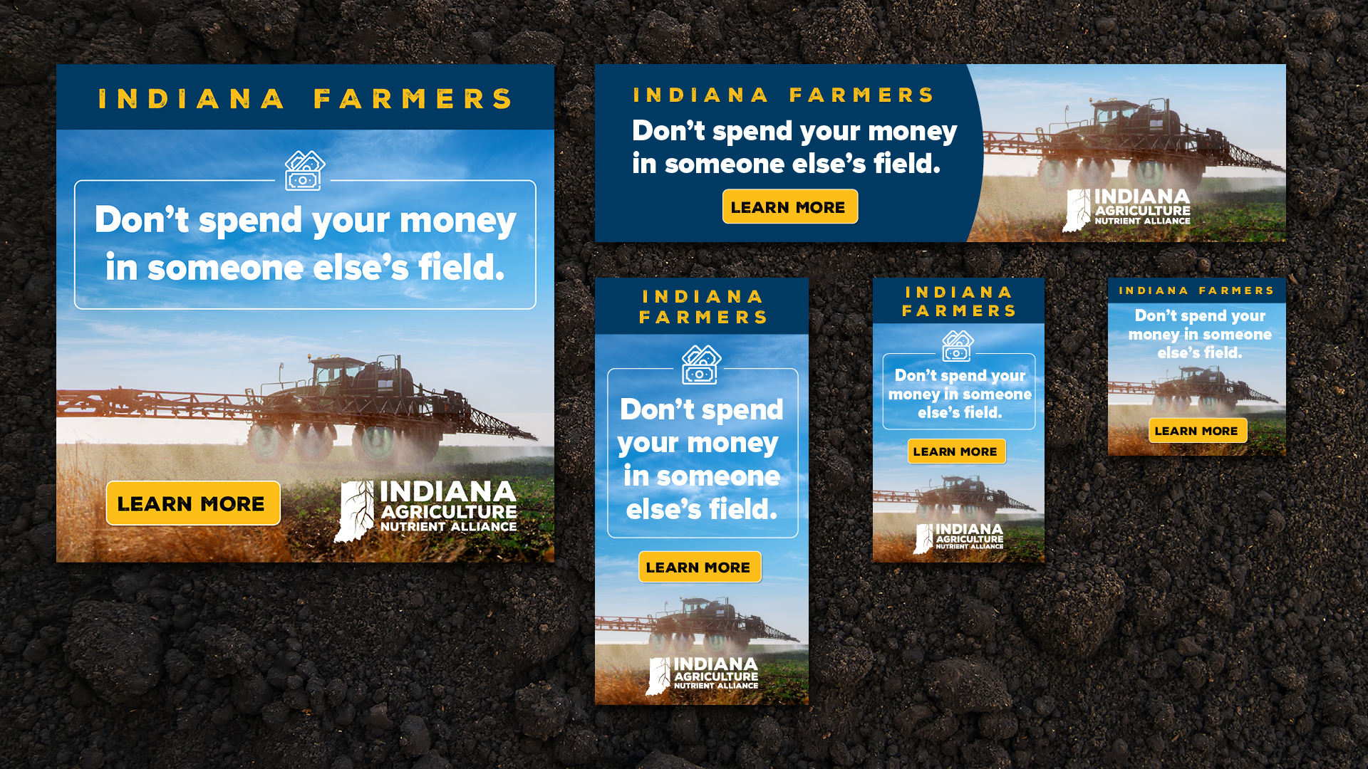 For the Indiana Agriculture Nutrient Alliance (IANA), I designed a series of Google display ads to drive engagement and position IANA as a trusted resource for Indiana farmers. Using existing photography assets and a bold, attention-grabbing headline — “Don’t spend your money in someone else’s field” — the campaign created an immediate link between economic impact and the organization’s mission to support local growers.