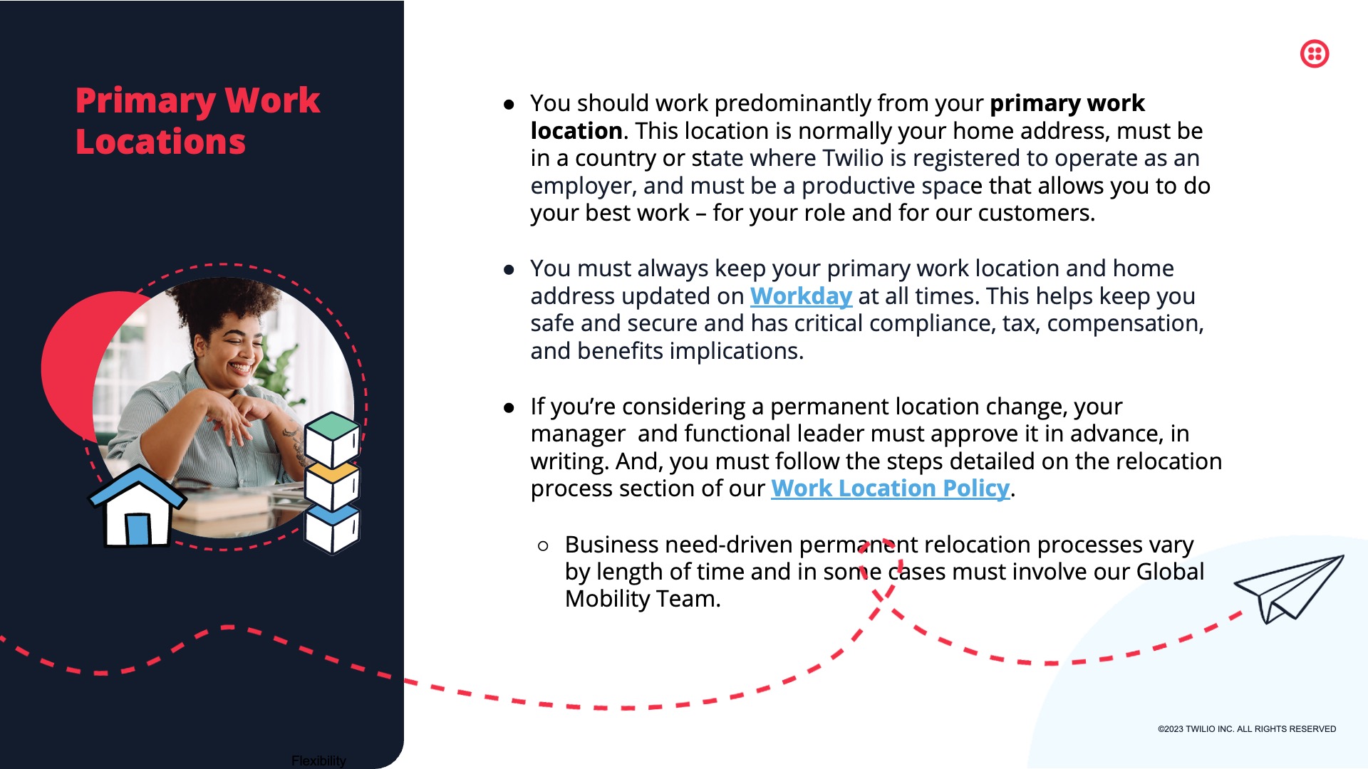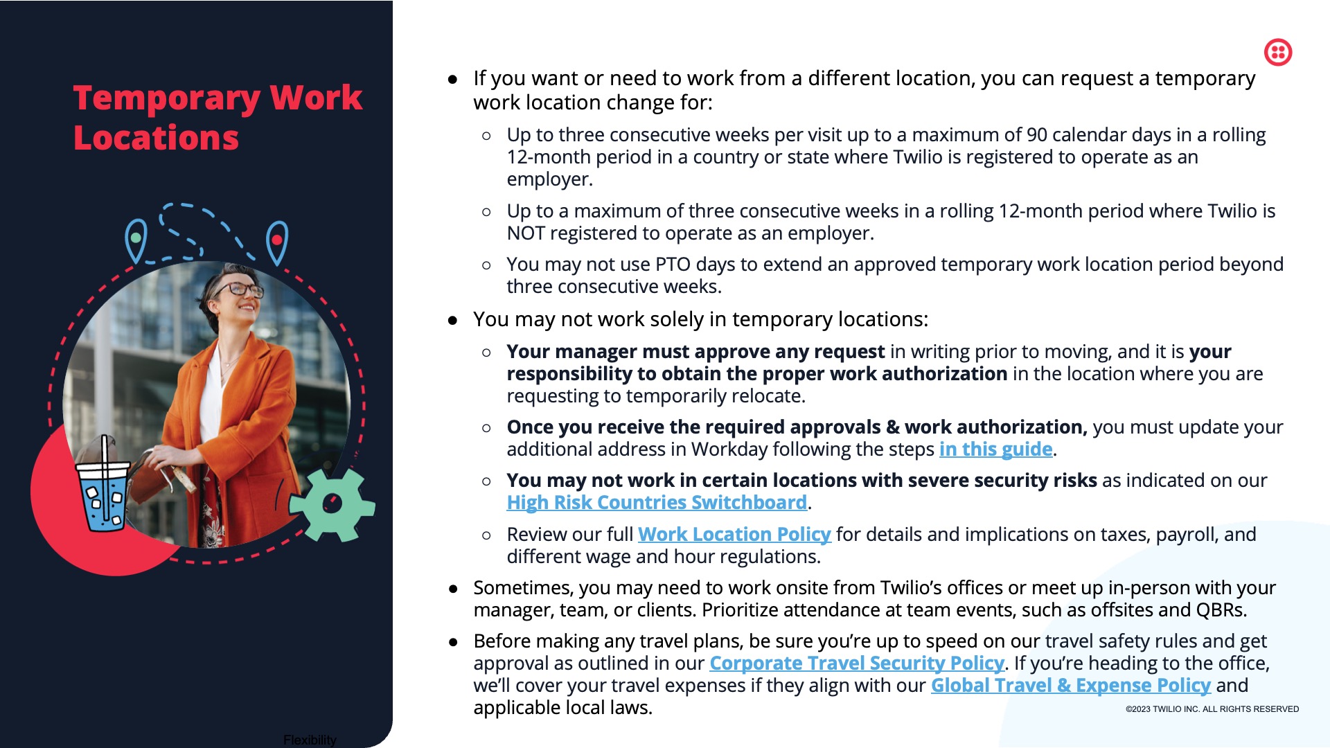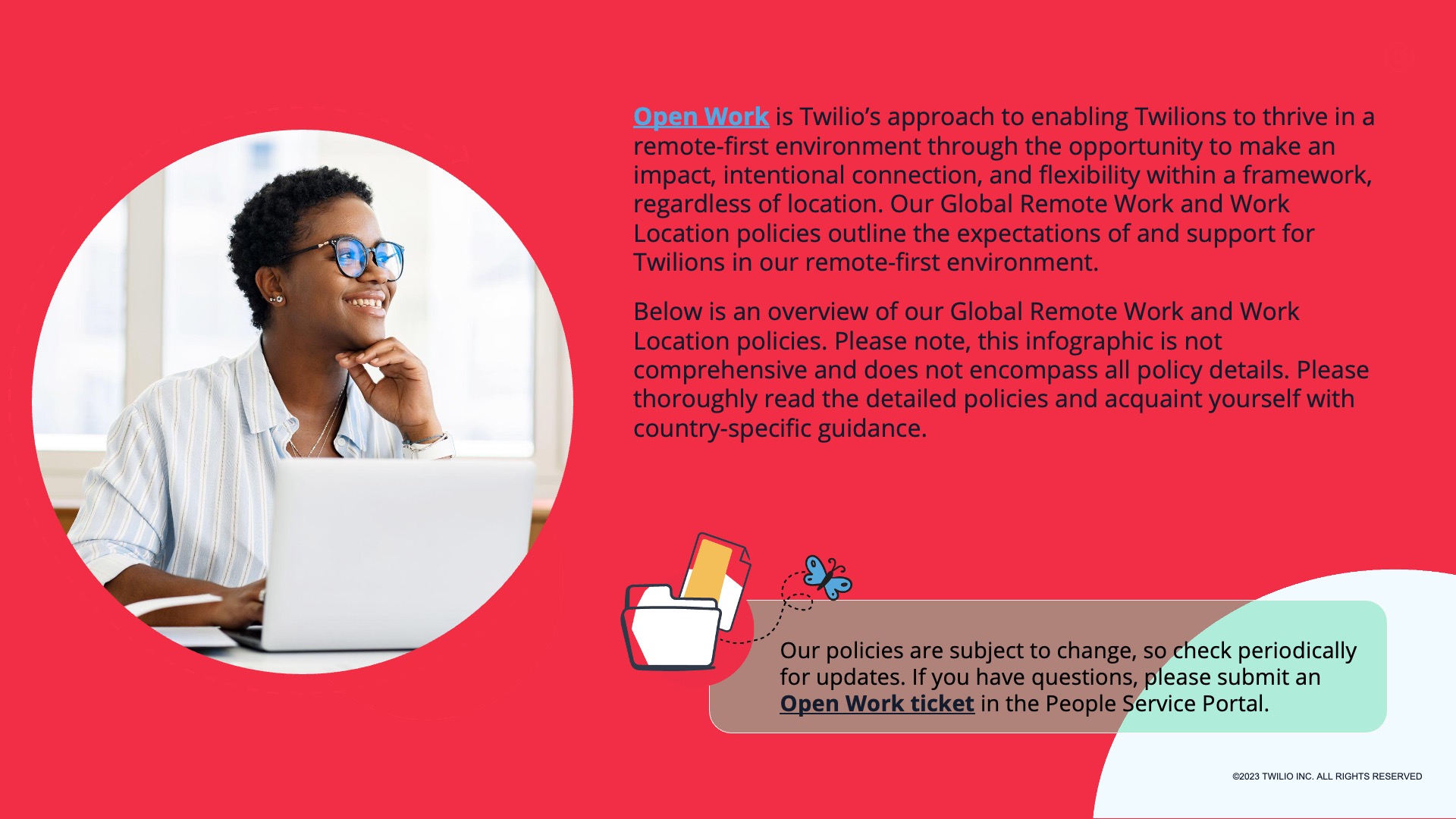 Designed for Twilio, this presentation features selected slides from a comprehensive internal deck supporting the rollout of Twilio’s Global Remote Work and Work Location policies. Built for a remote-first workforce, the deck translates detailed policy guidance into a clear, approachable visual system—helping employees understand expectations around flexibility, location, security, and support while reinforcing Twilio’s broader Open Work philosophy.