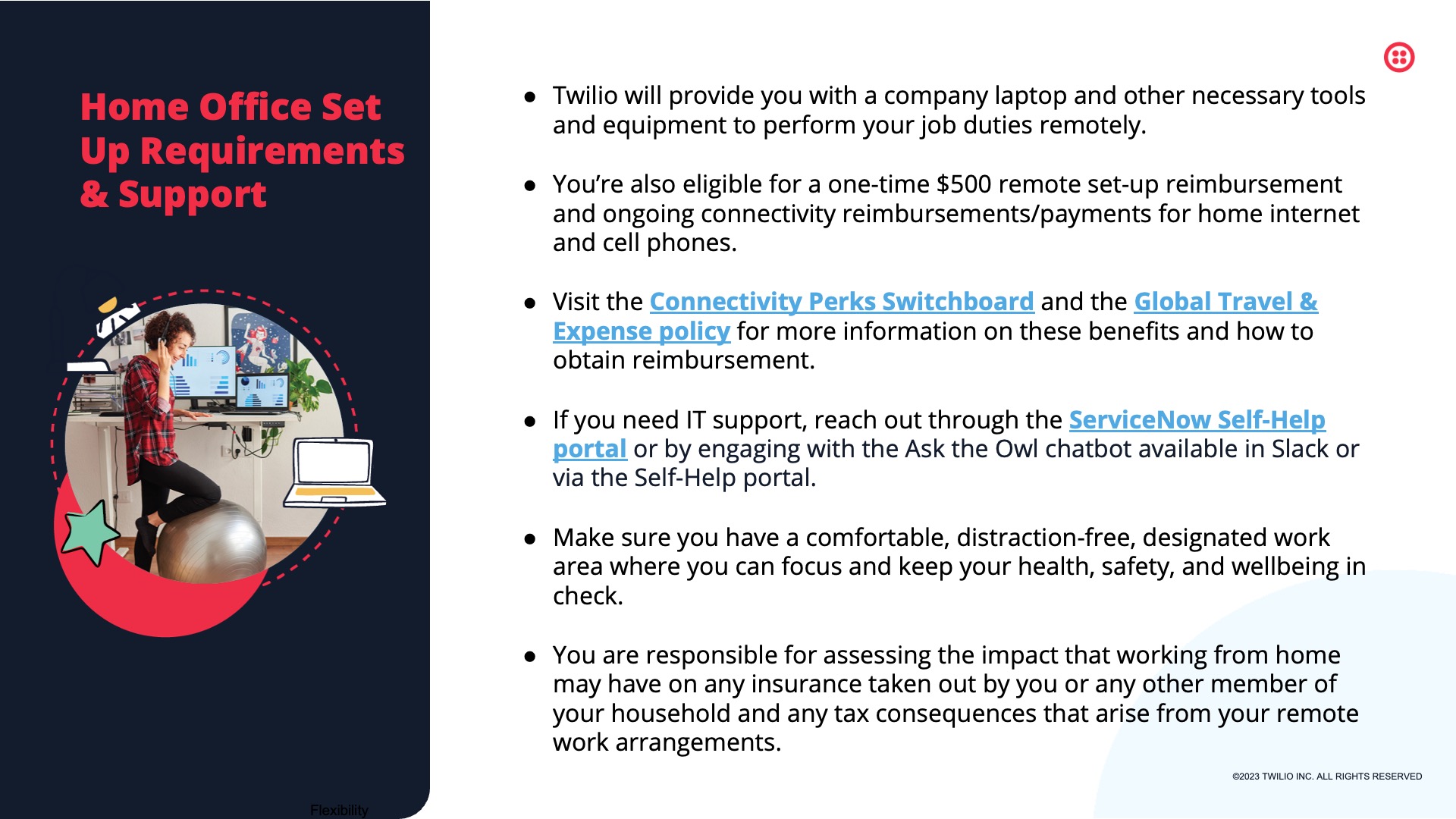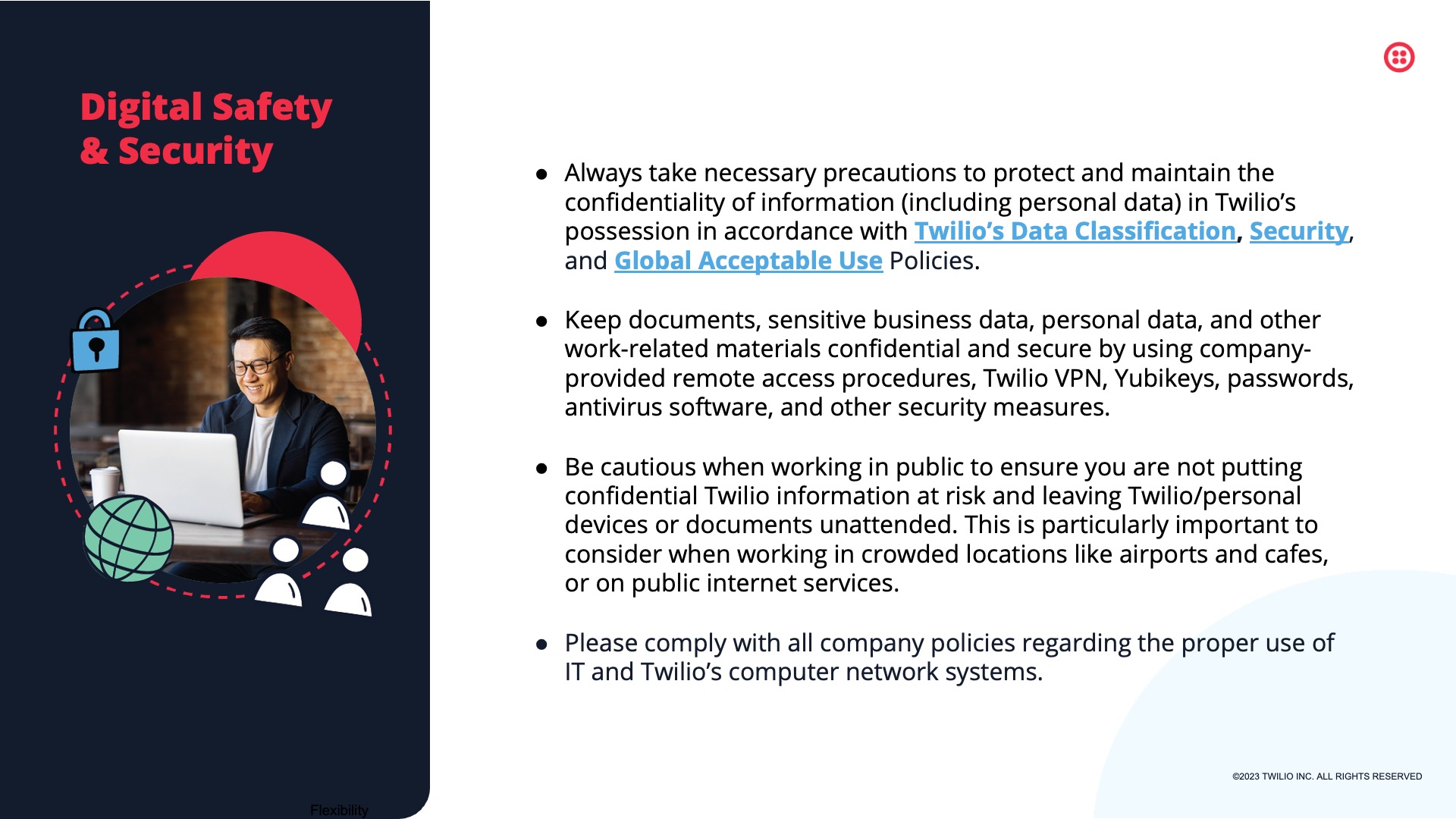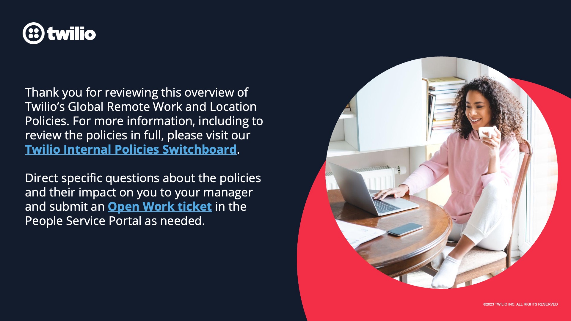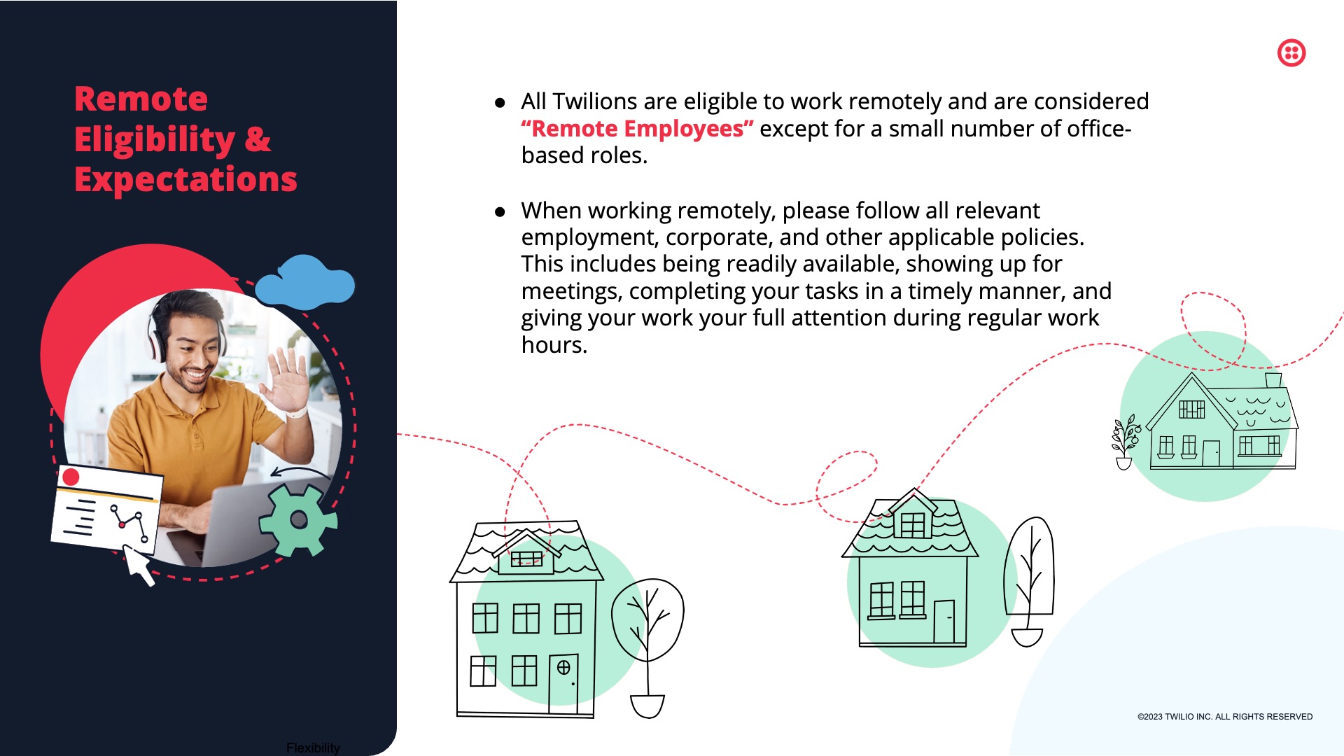 Designed for Twilio, this presentation features selected slides from a comprehensive internal deck supporting the rollout of Twilio’s Global Remote Work and Work Location policies. Built for a remote-first workforce, the deck translates detailed policy guidance into a clear, approachable visual system—helping employees understand expectations around flexibility, location, security, and support while reinforcing Twilio’s broader Open Work philosophy.