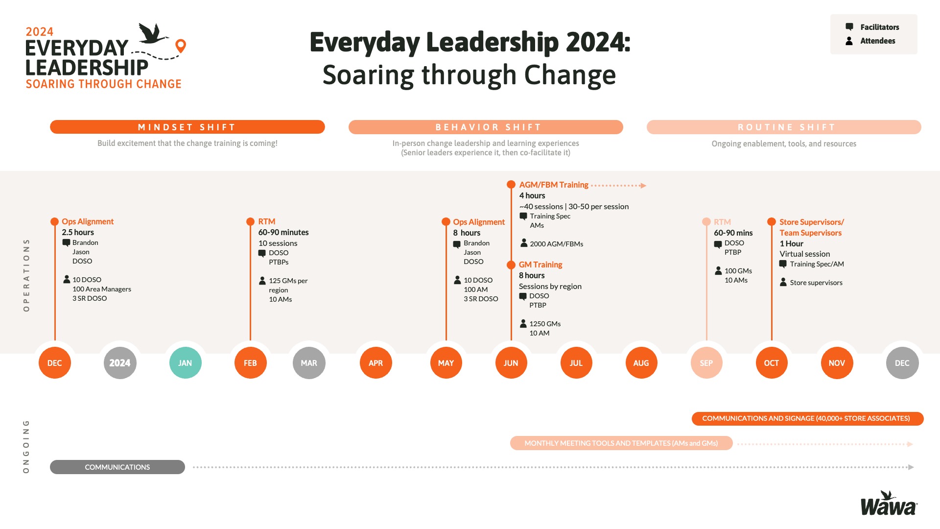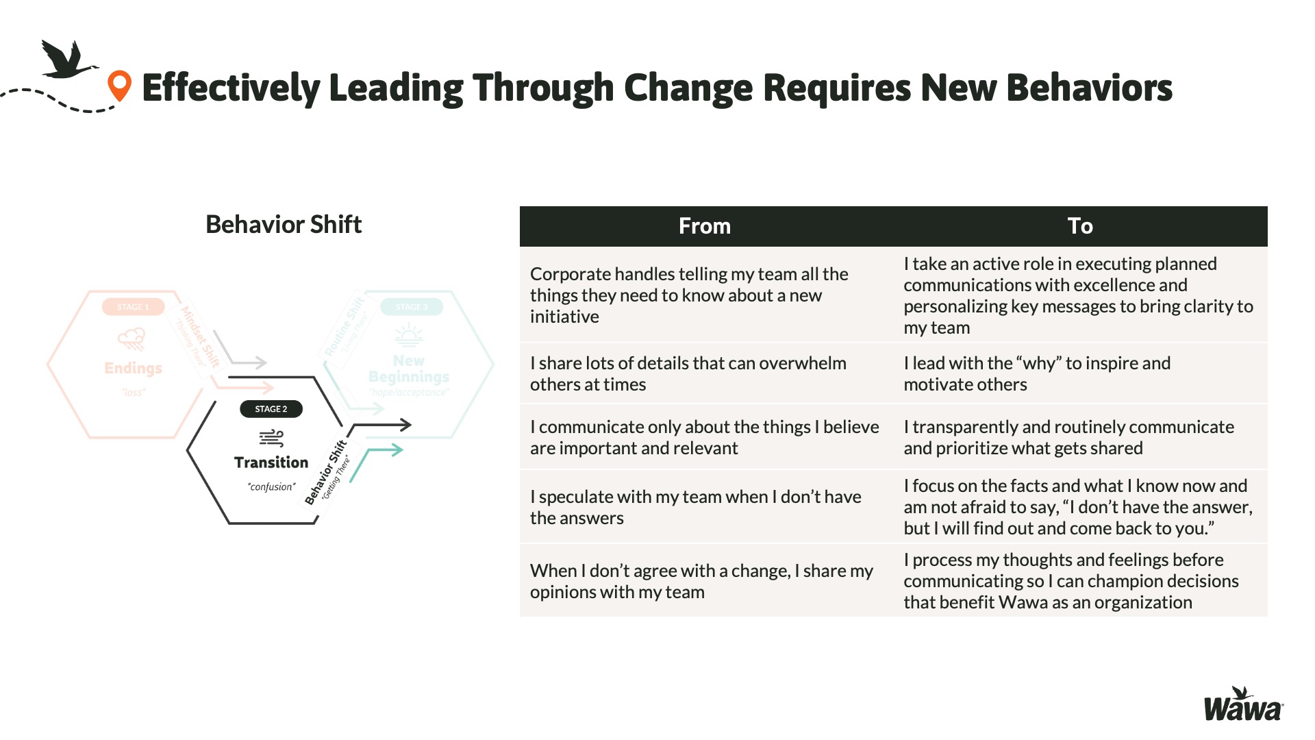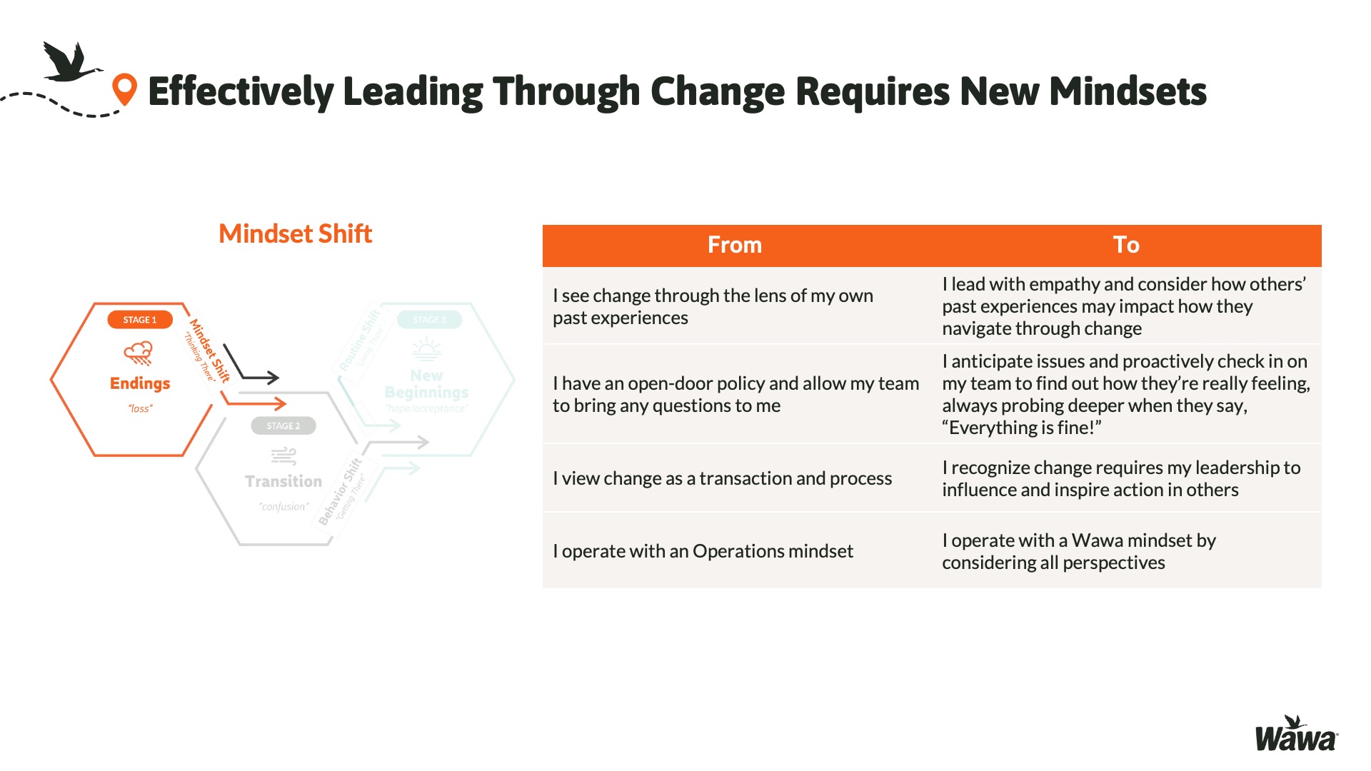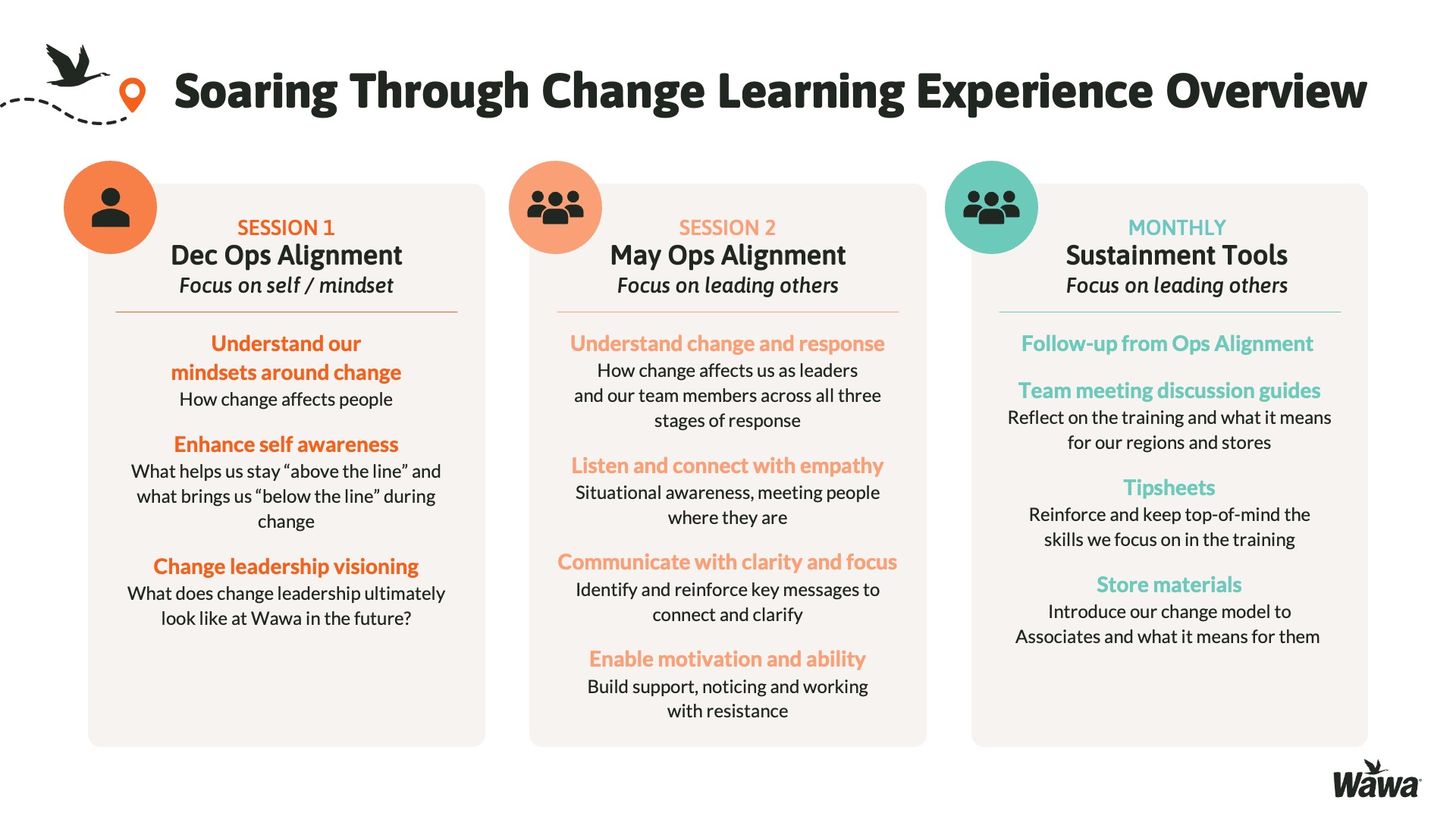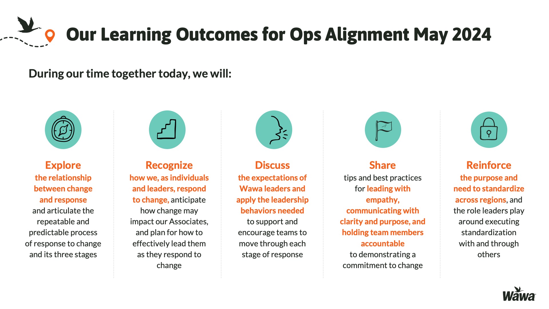 Designed for Wawa, this work represents selected slides from a 75-slide, facilitator-led Operations Alignment workshop used in live leadership training. The deck was built to help leaders navigate organizational change by understanding the transition process, anticipating associate impact, and applying consistent leadership behaviors that reinforce clarity, empathy, accountability, and standardization across regions.