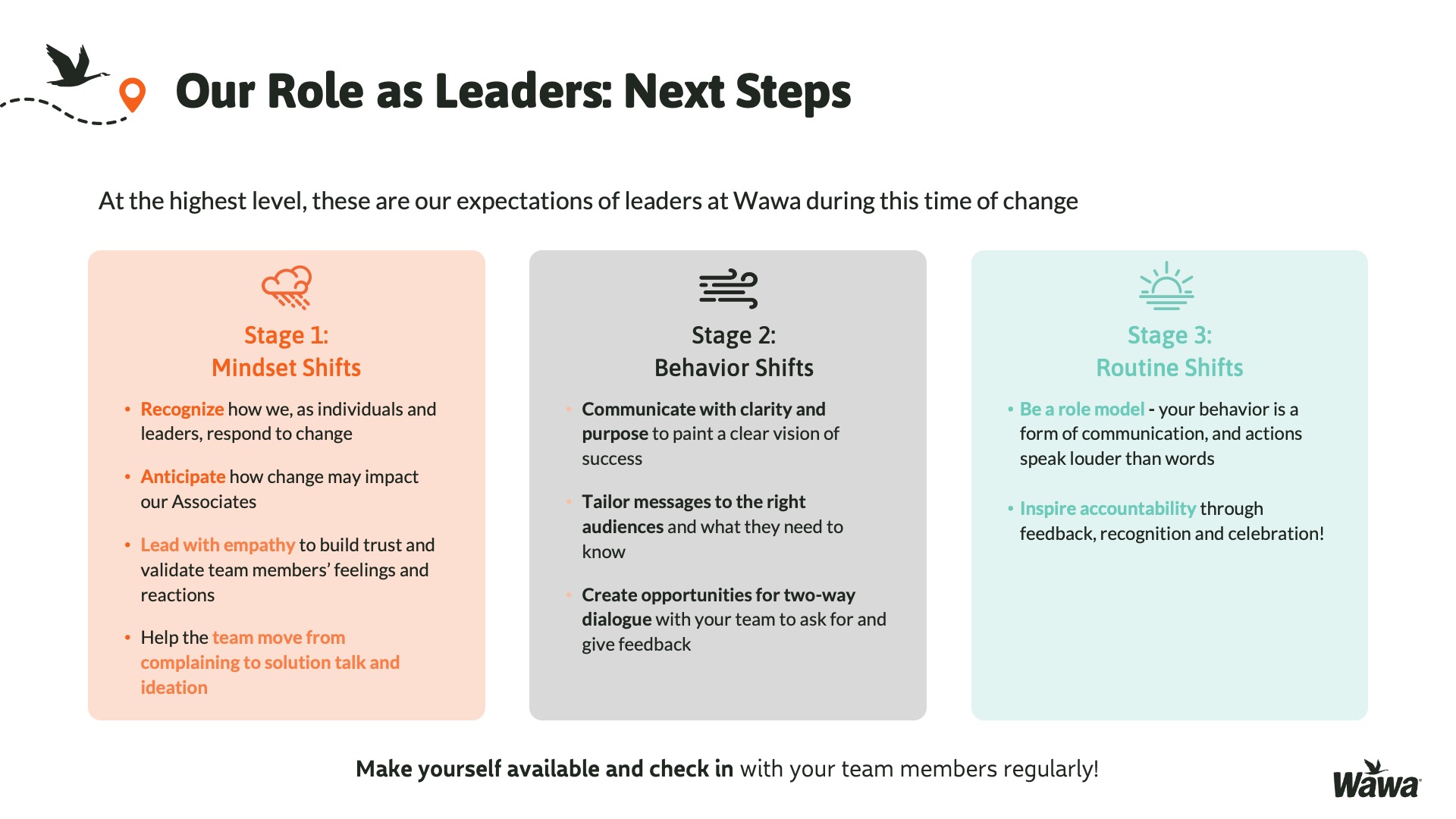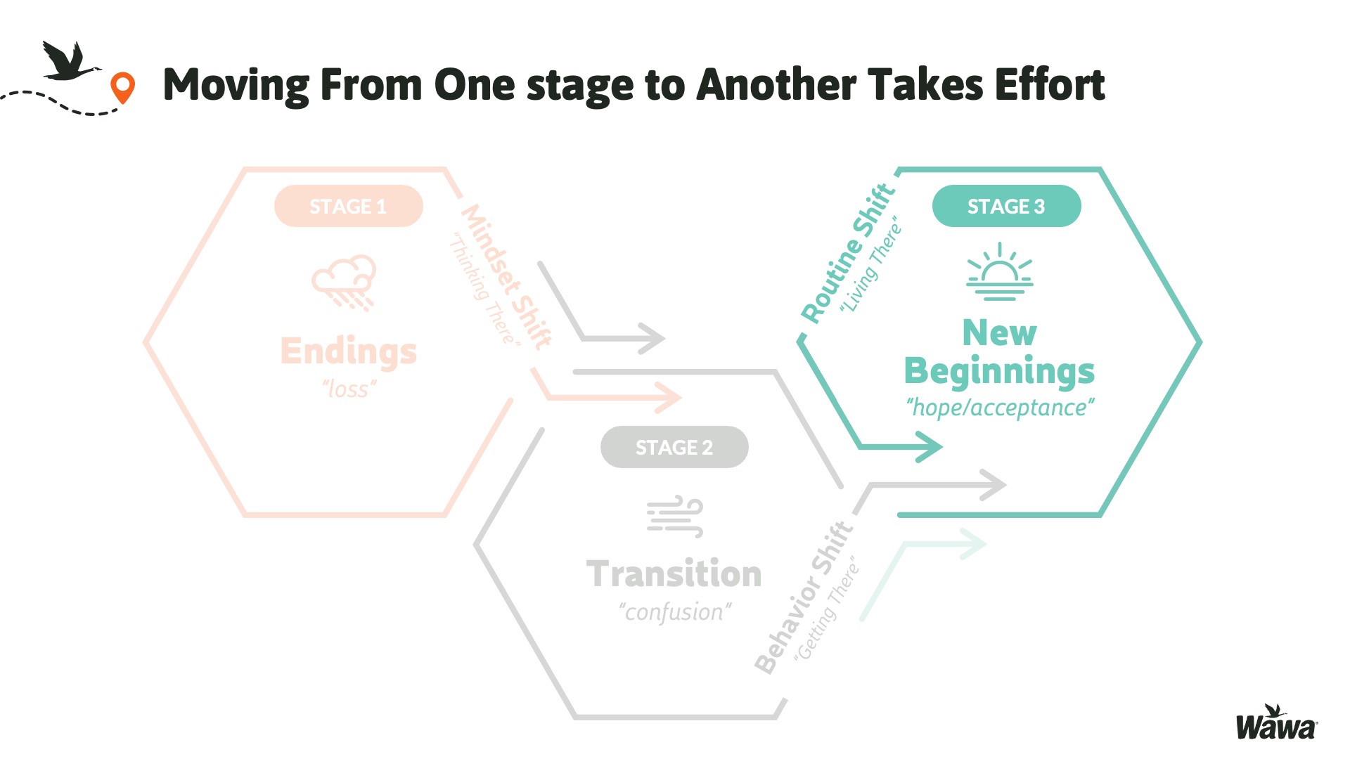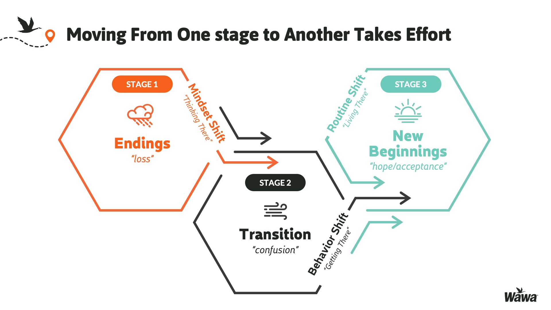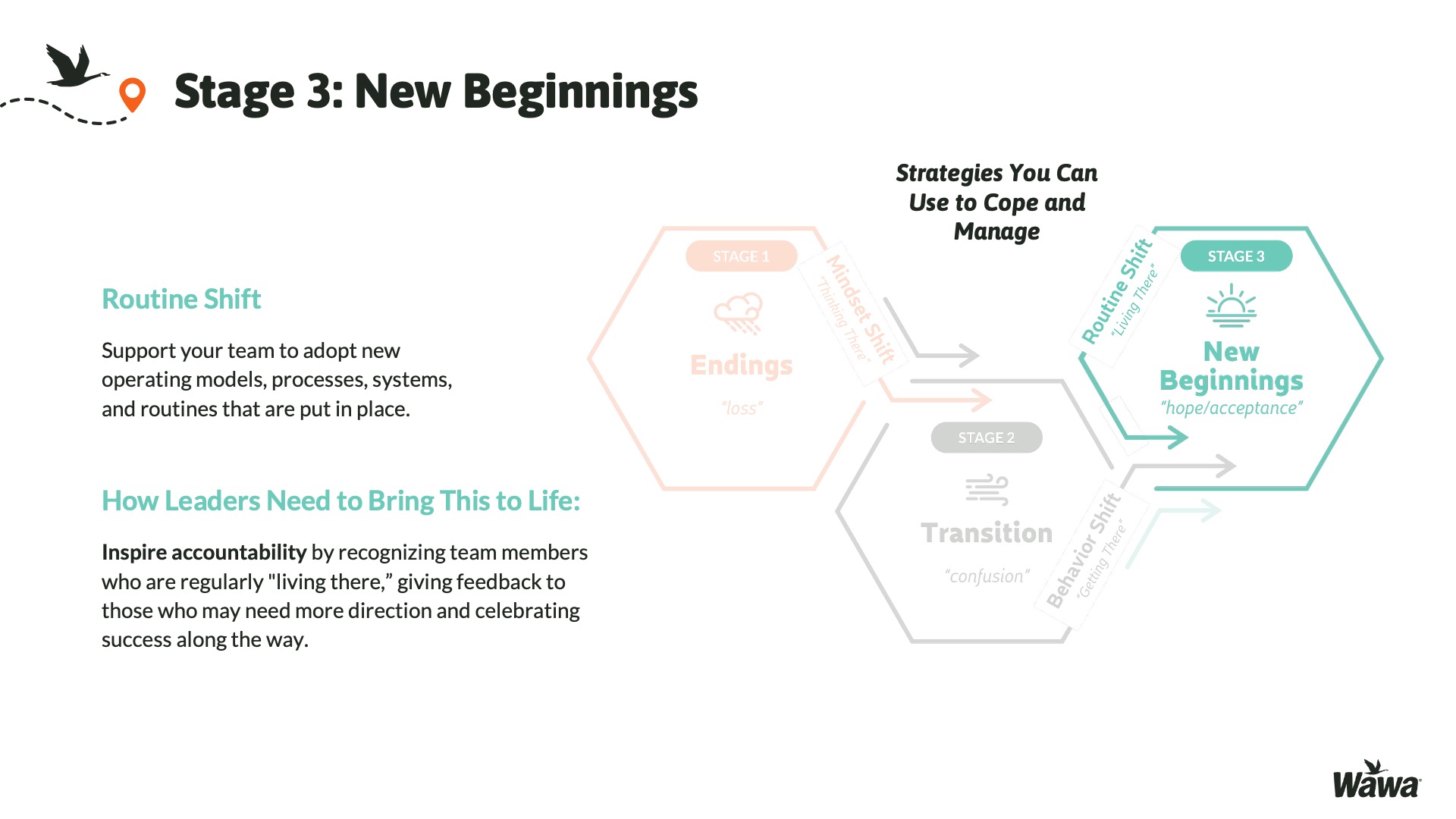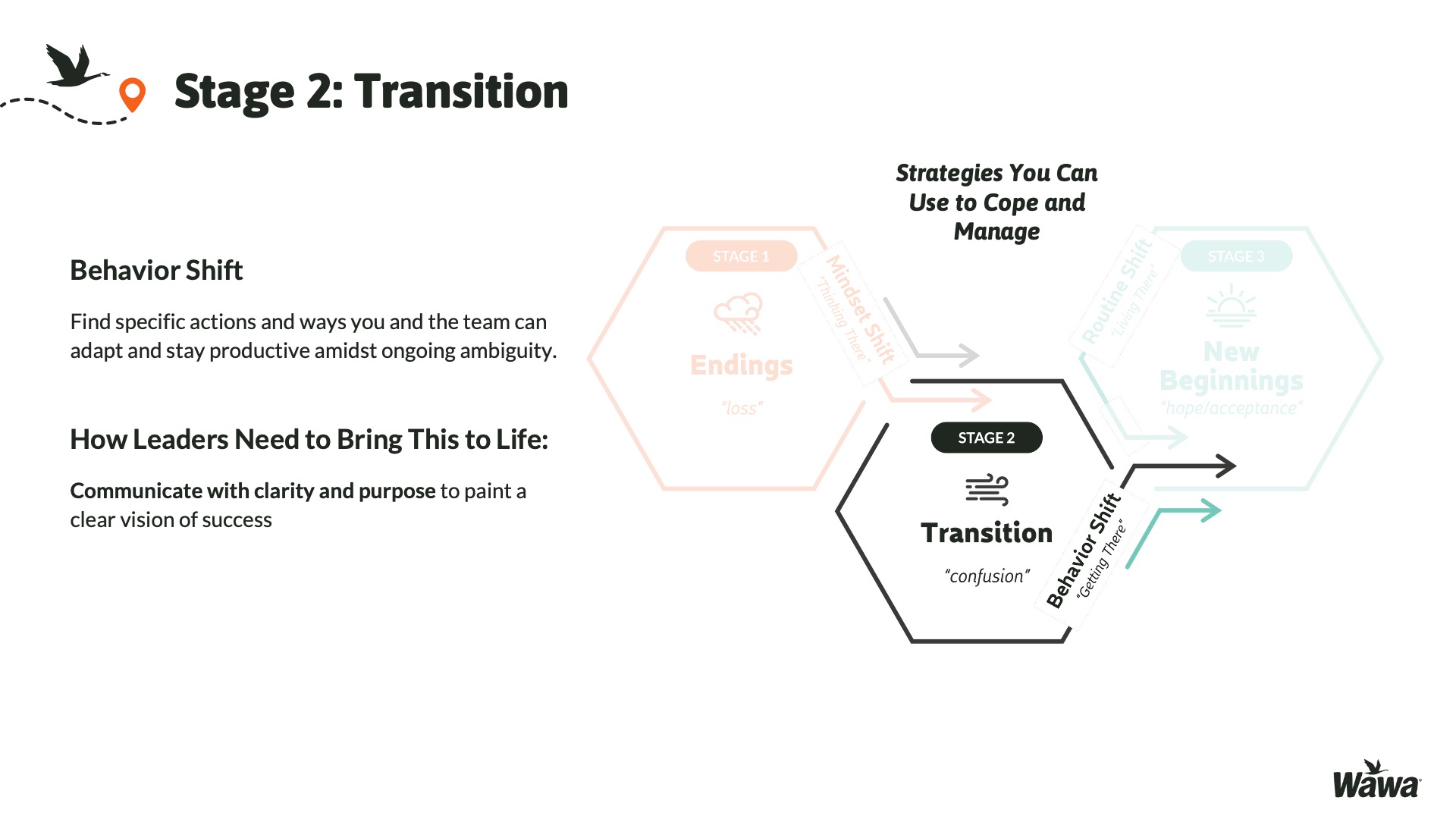 Designed for Wawa, this work represents selected slides from a 75-slide, facilitator-led Operations Alignment workshop used in live leadership training. The deck was built to help leaders navigate organizational change by understanding the transition process, anticipating associate impact, and applying consistent leadership behaviors that reinforce clarity, empathy, accountability, and standardization across regions.