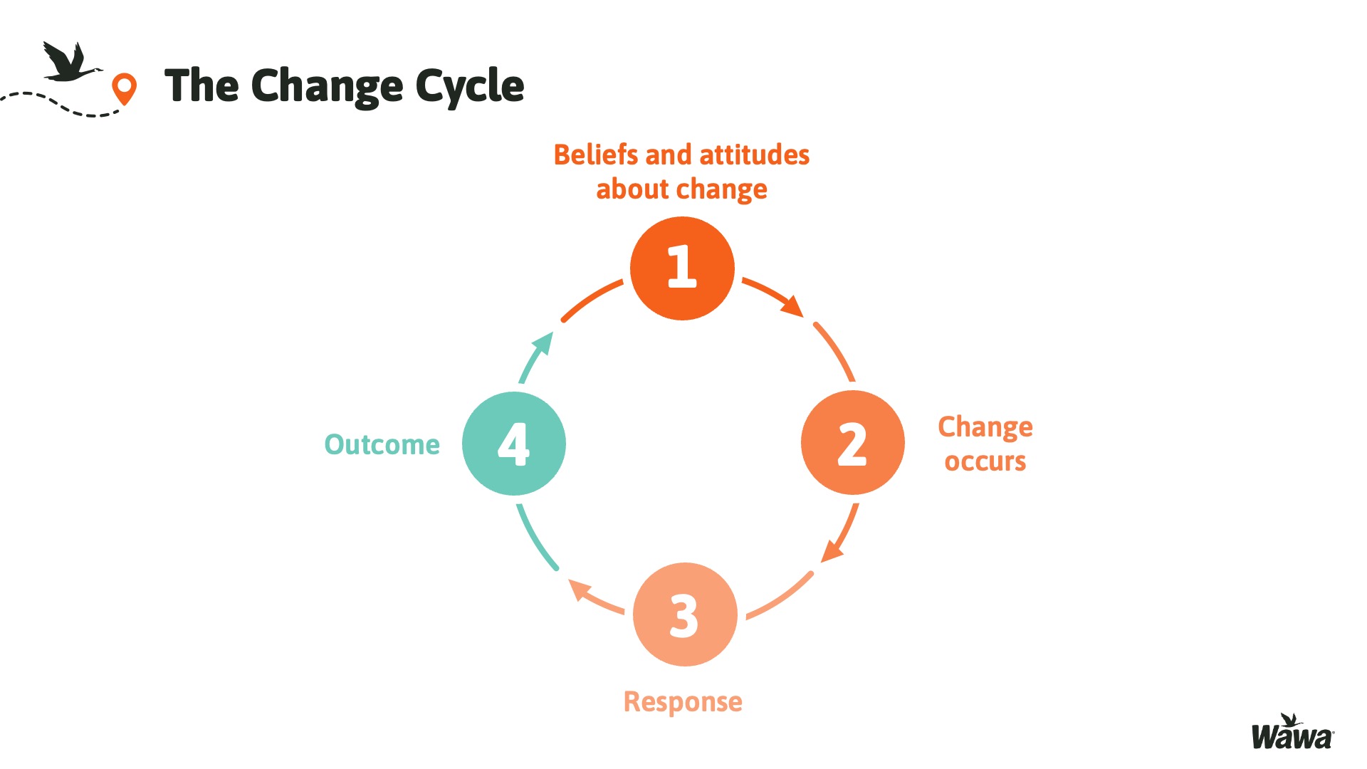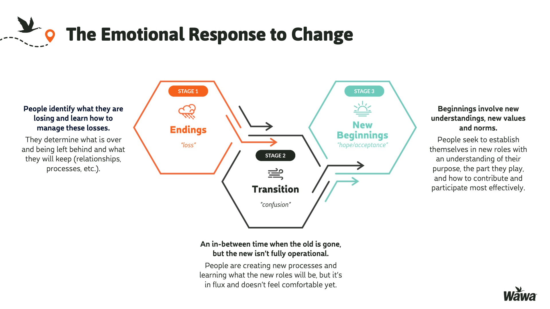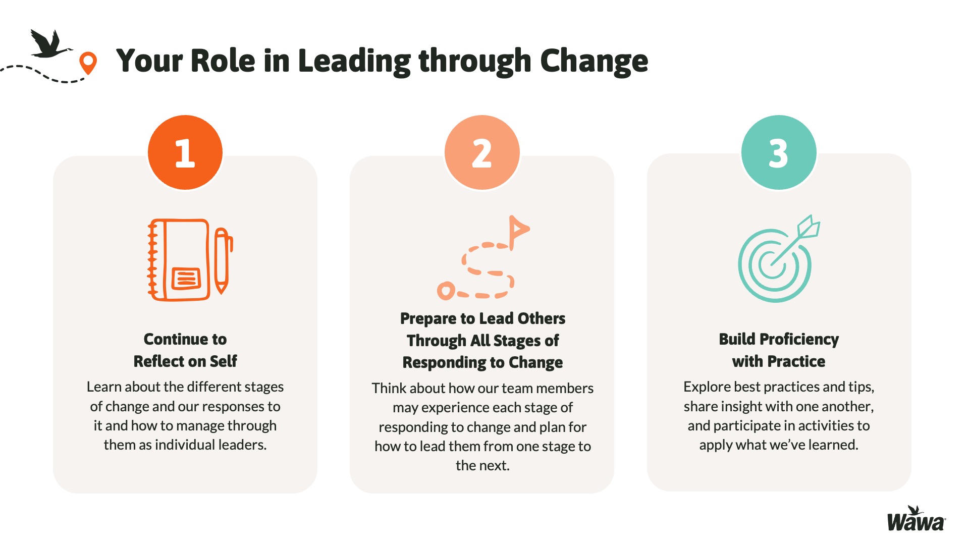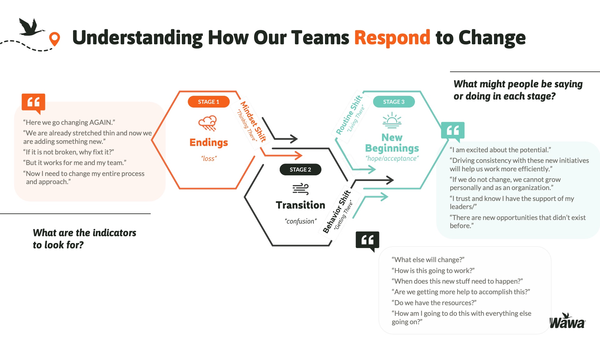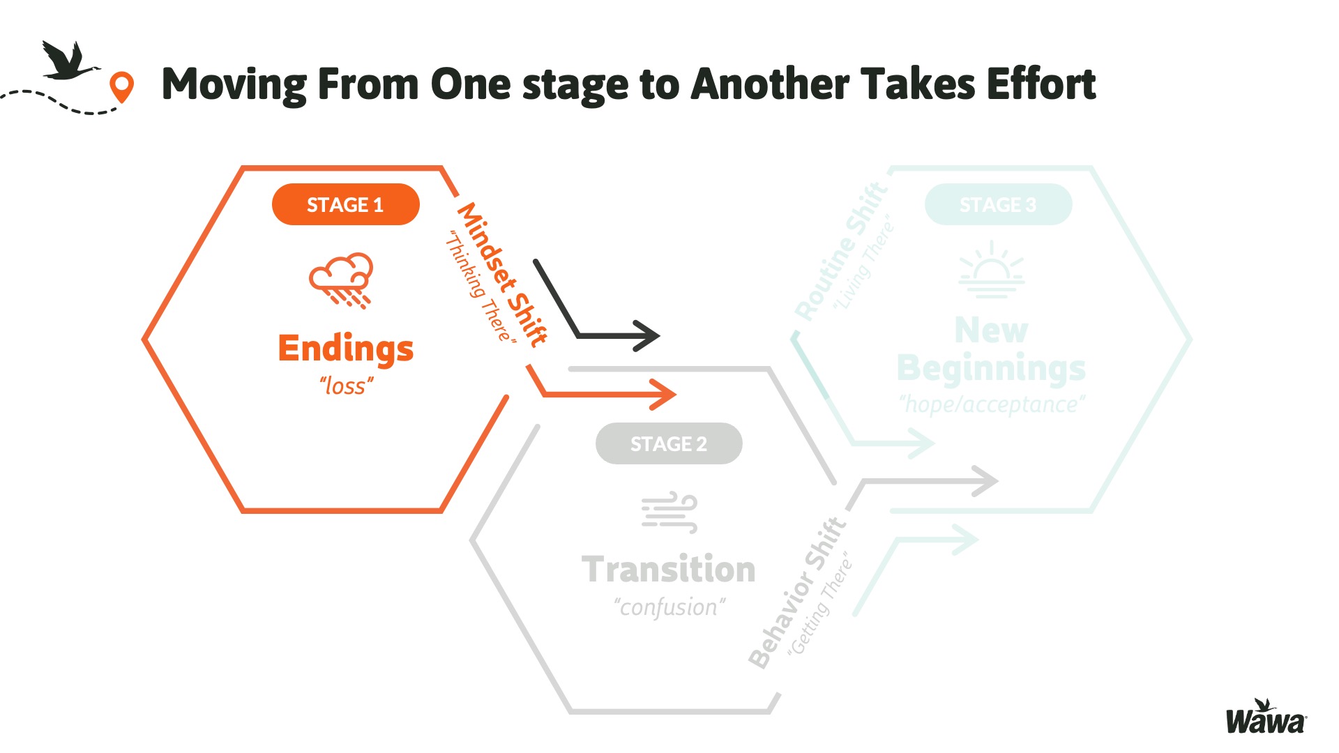 Designed for Wawa, this work represents selected slides from a 75-slide, facilitator-led Operations Alignment workshop used in live leadership training. The deck was built to help leaders navigate organizational change by understanding the transition process, anticipating associate impact, and applying consistent leadership behaviors that reinforce clarity, empathy, accountability, and standardization across regions.
