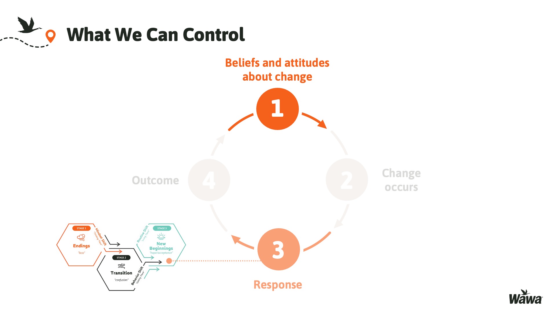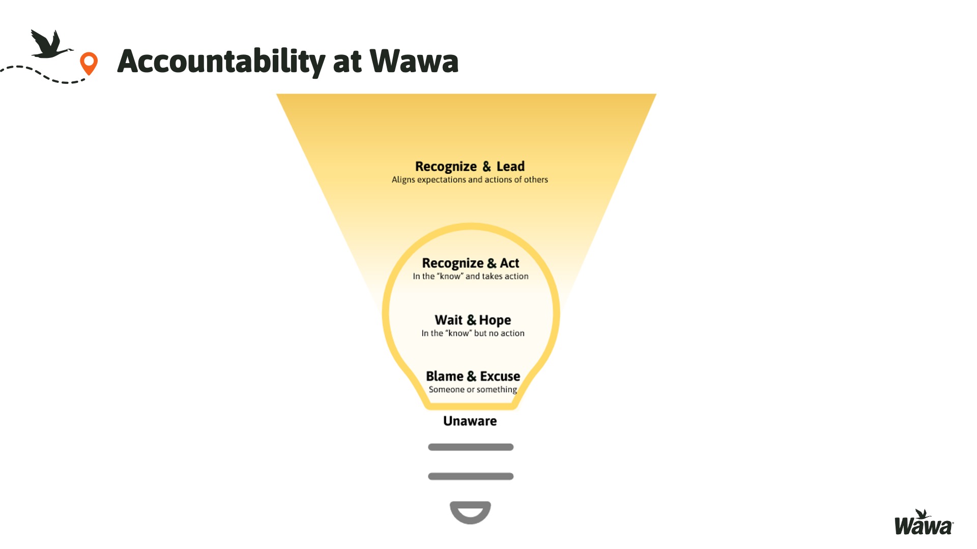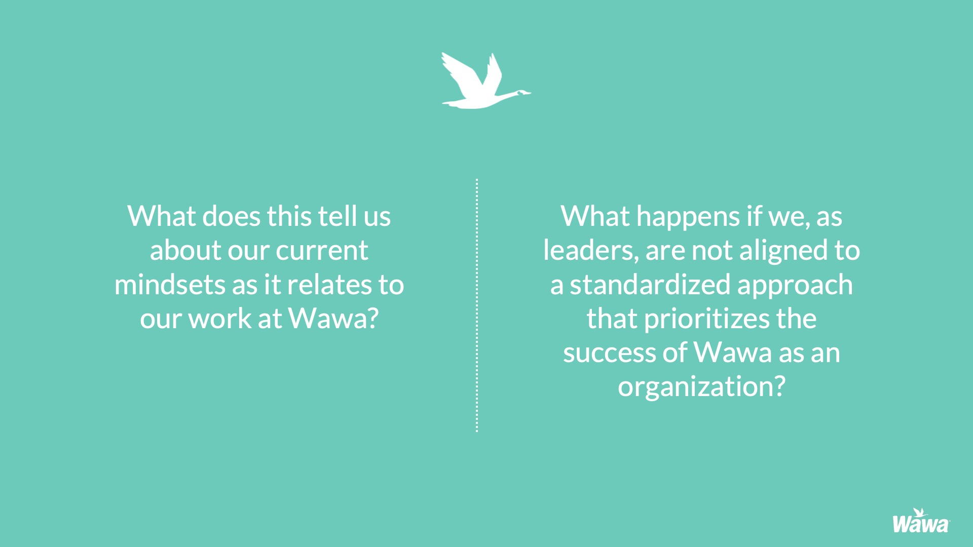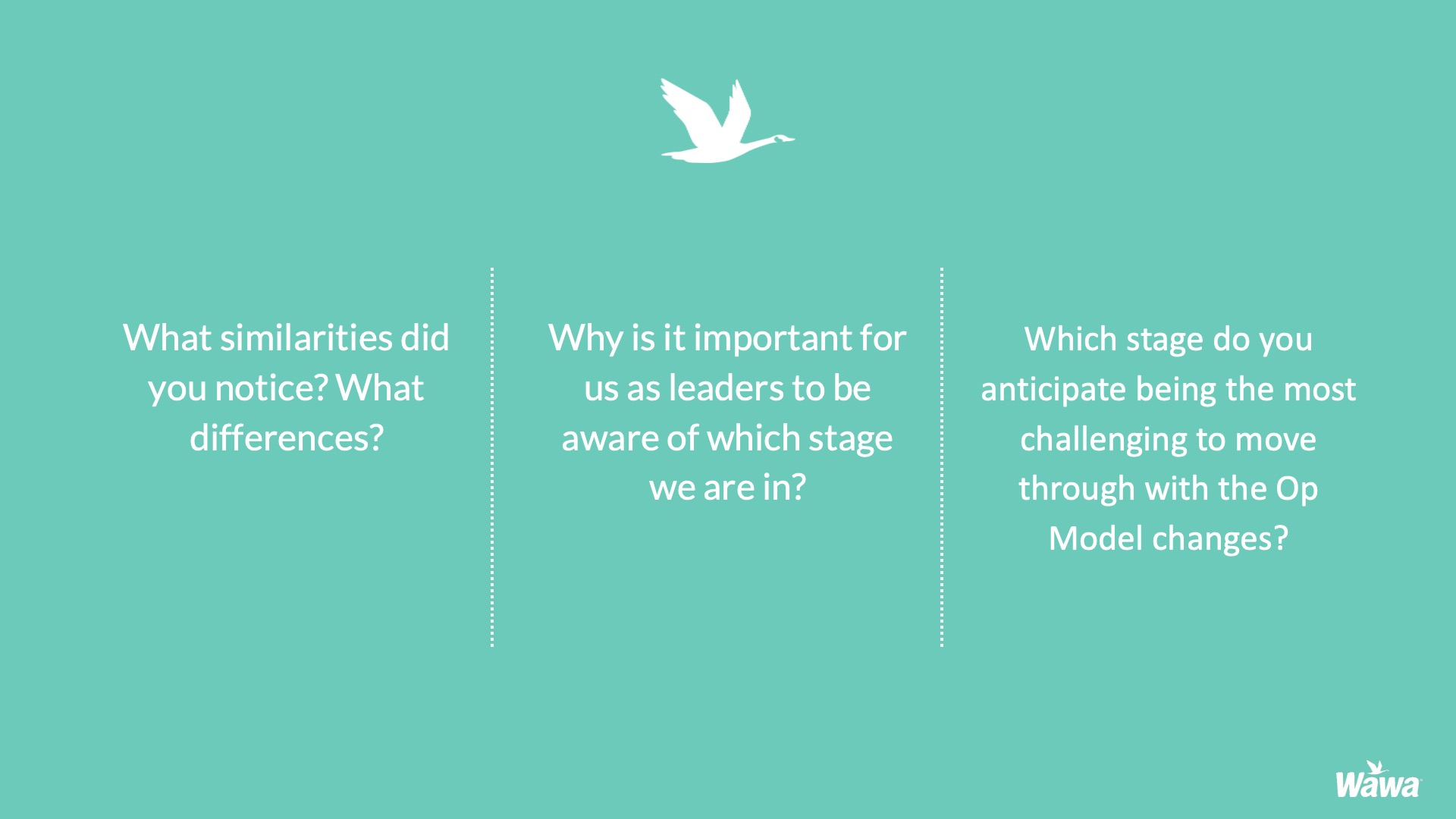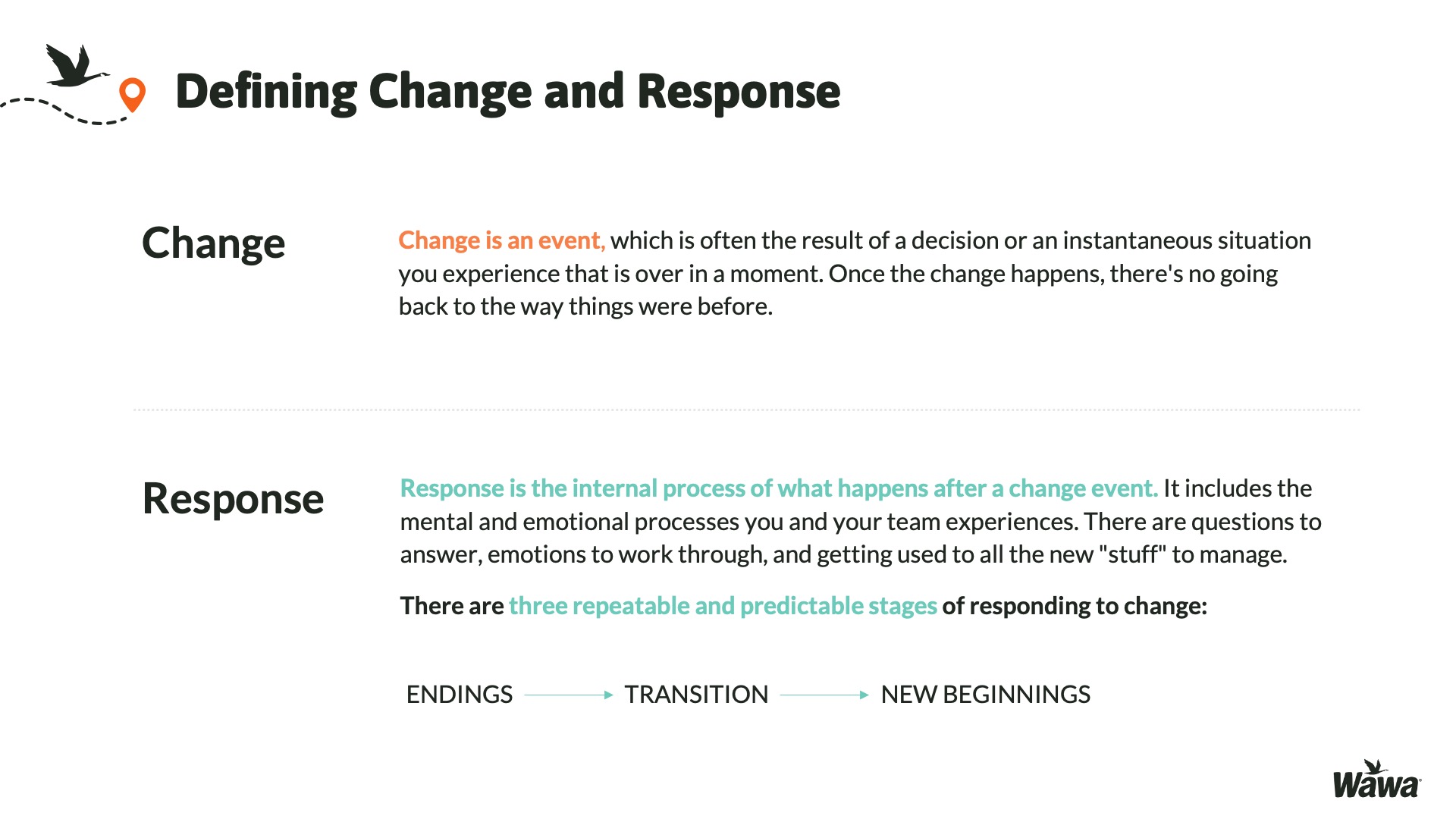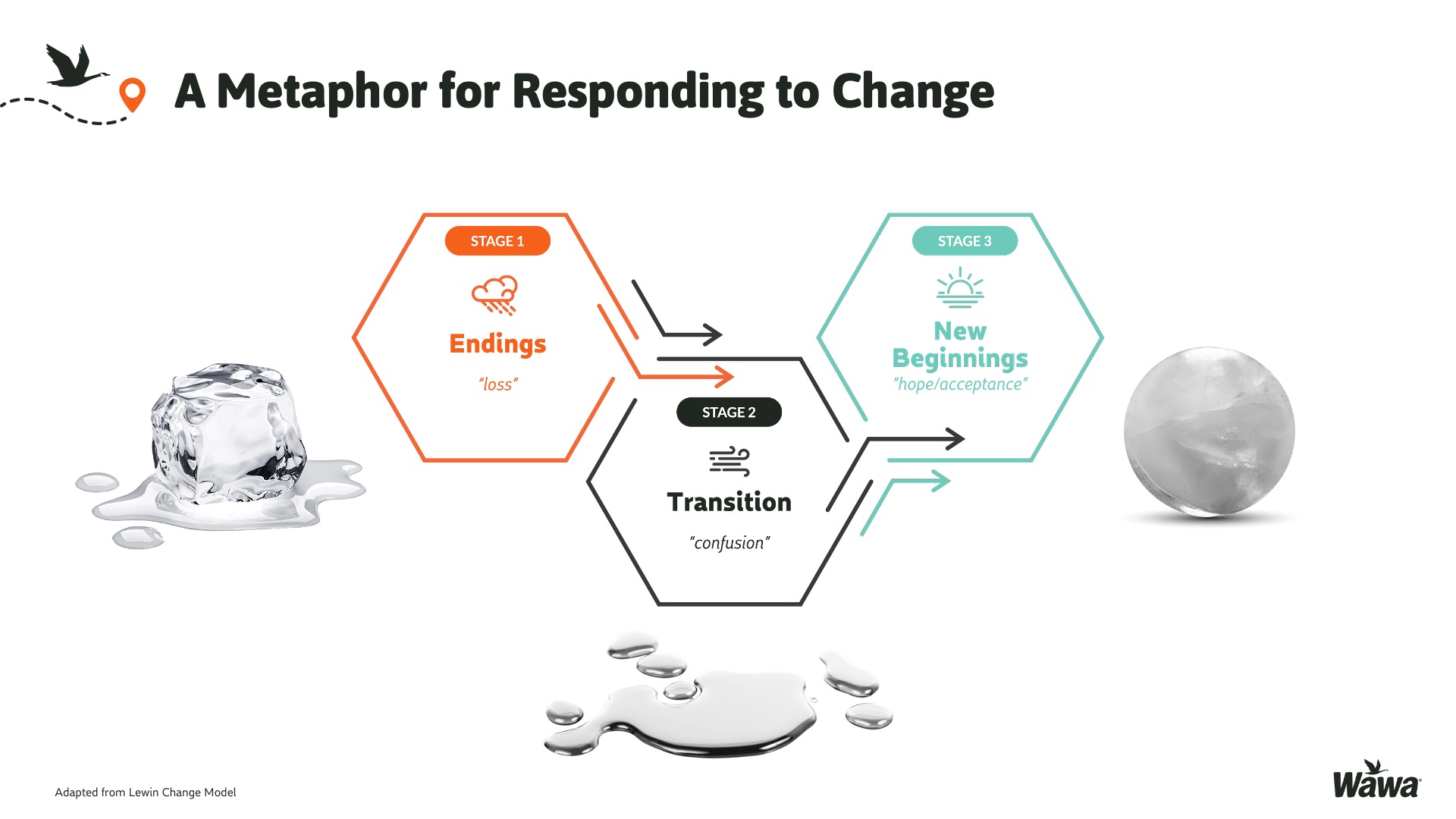 Designed for Wawa, this work represents selected slides from a 75-slide, facilitator-led Operations Alignment workshop used in live leadership training. The deck was built to help leaders navigate organizational change by understanding the transition process, anticipating associate impact, and applying consistent leadership behaviors that reinforce clarity, empathy, accountability, and standardization across regions.