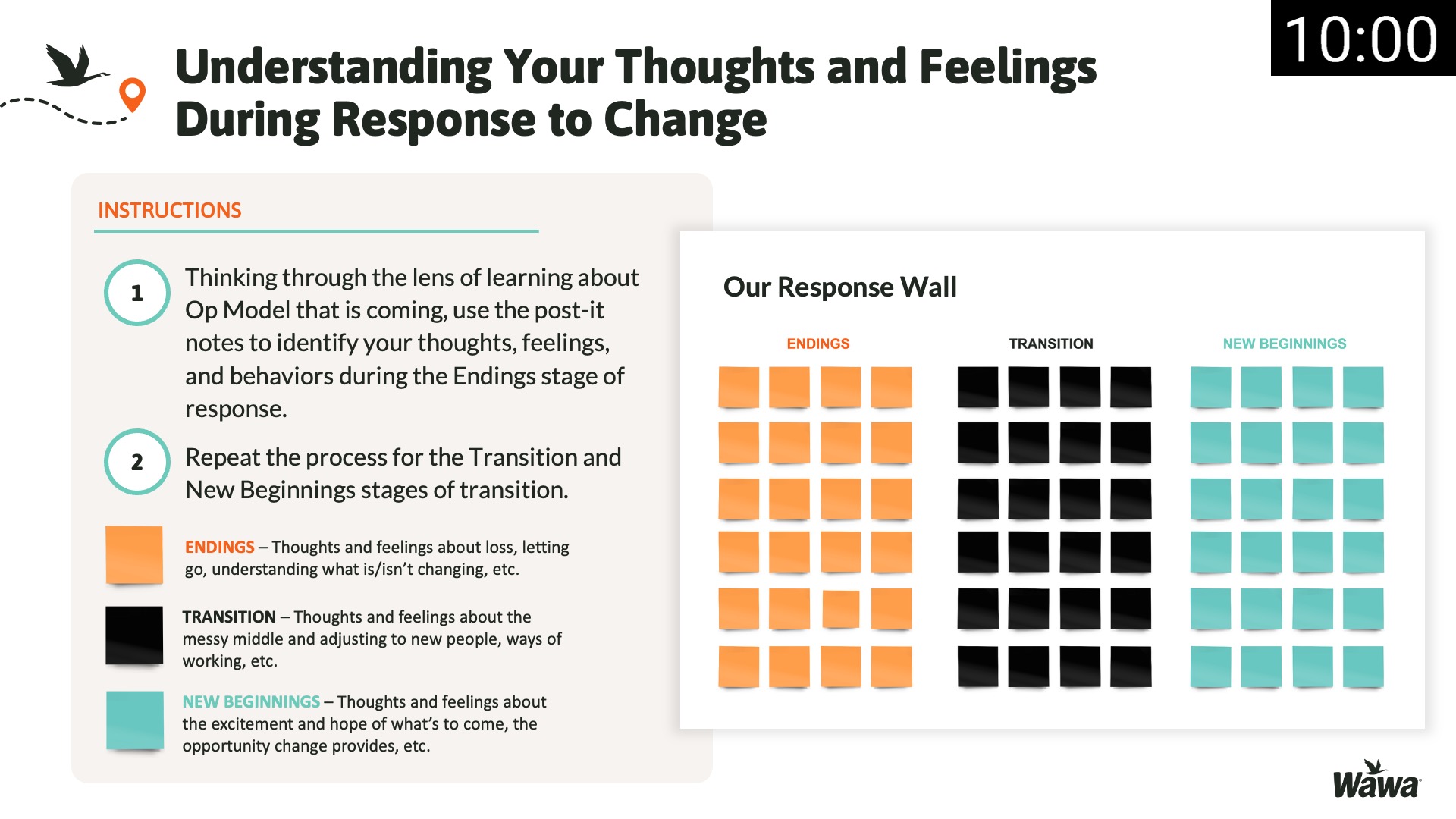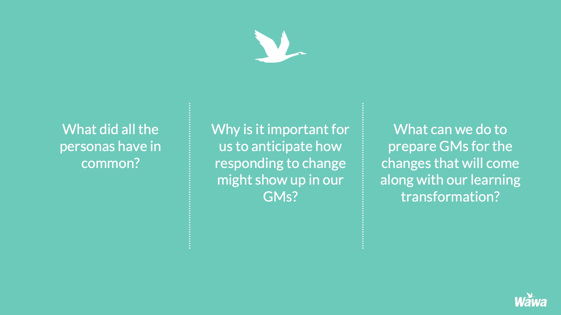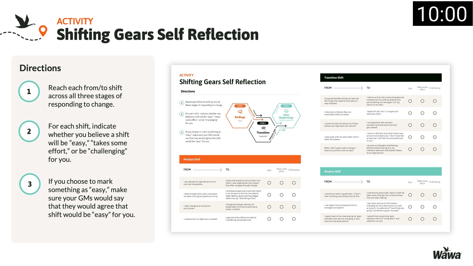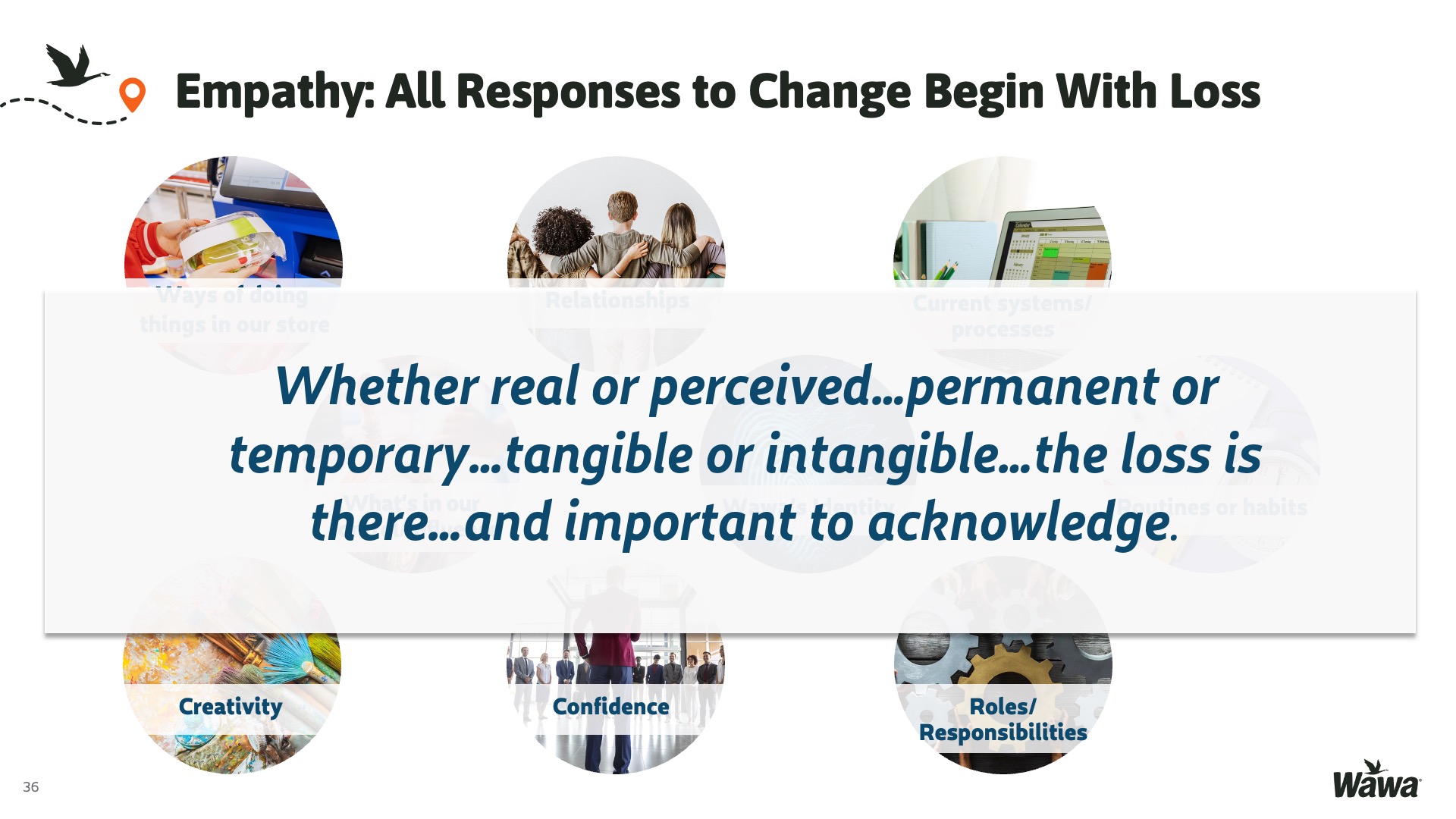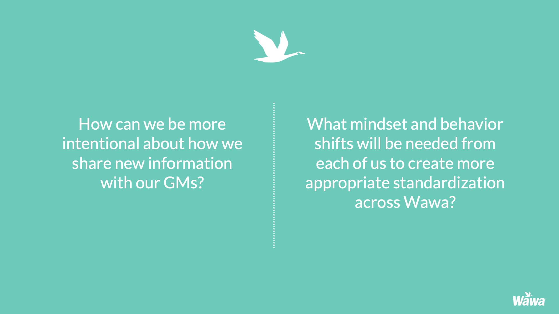Designed for Wawa, this work represents selected slides from a 75-slide, facilitator-led Operations Alignment workshop used in live leadership training. The deck was built to help leaders navigate organizational change by understanding the transition process, anticipating associate impact, and applying consistent leadership behaviors that reinforce clarity, empathy, accountability, and standardization across regions.