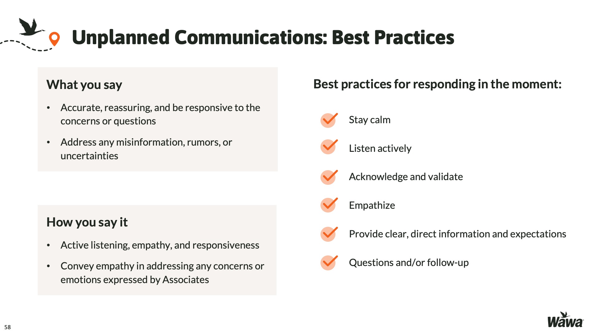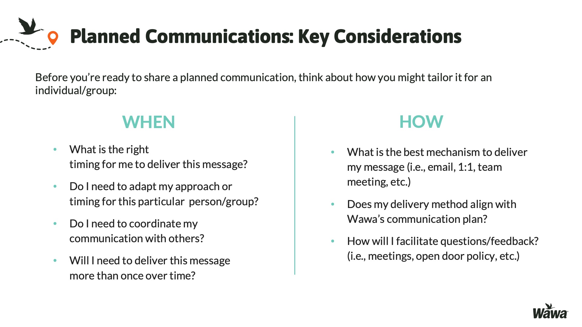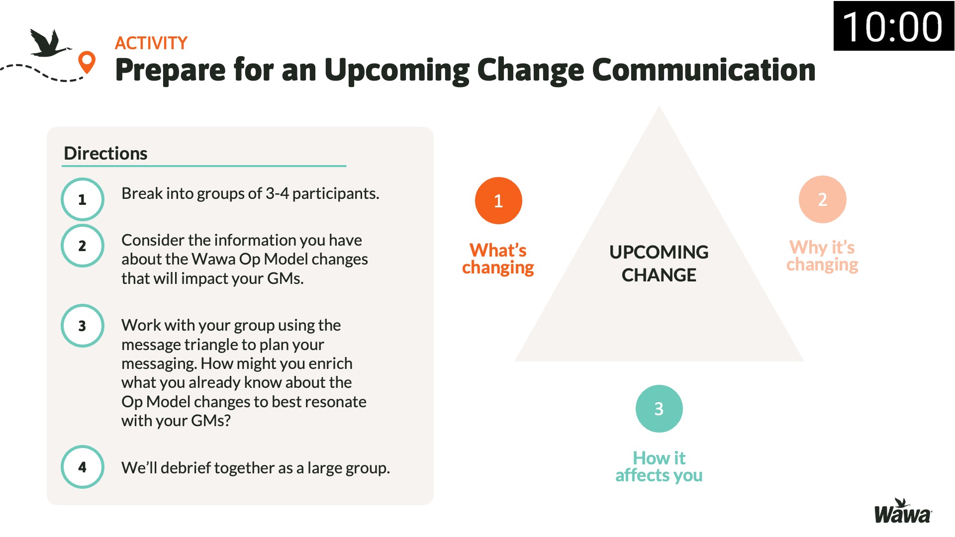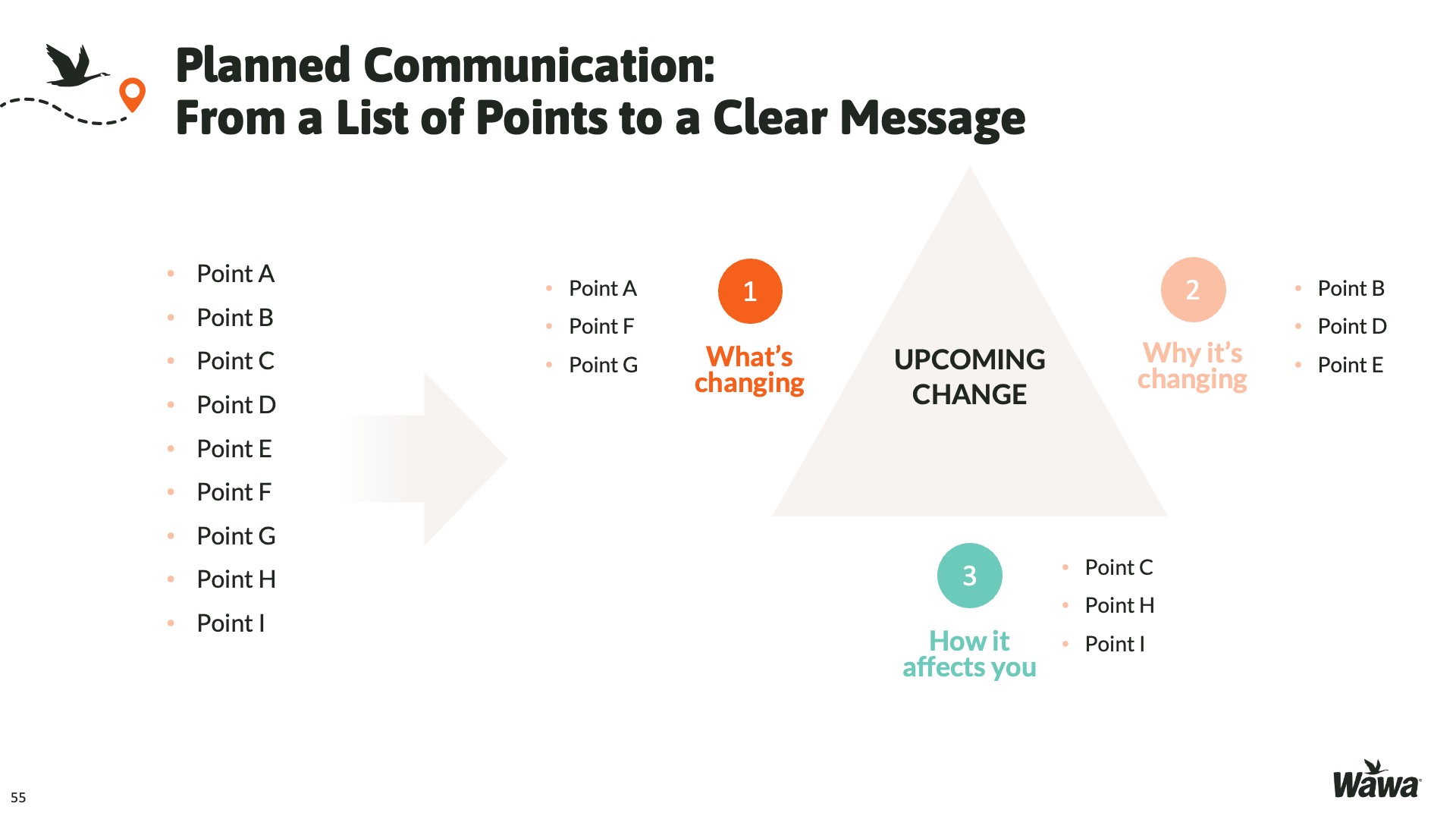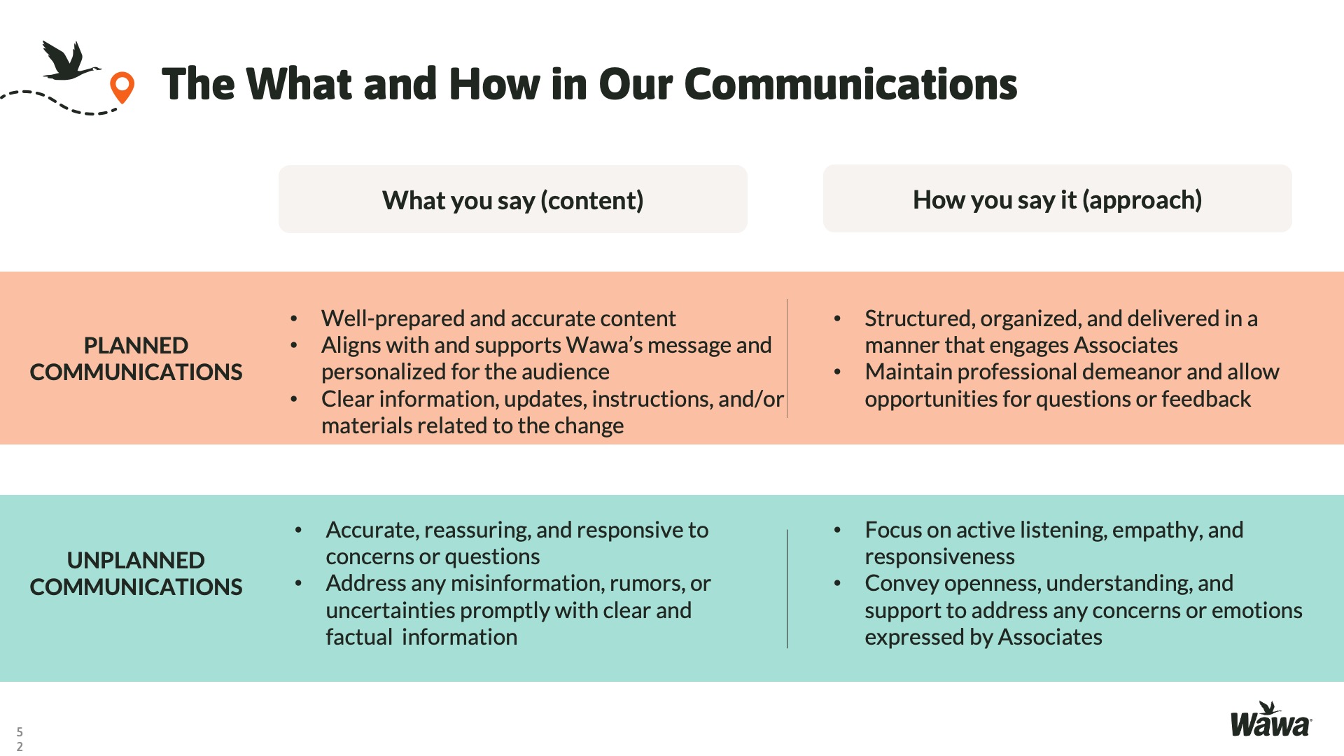 Designed for Wawa, this work represents selected slides from a 75-slide, facilitator-led Operations Alignment workshop used in live leadership training. The deck was built to help leaders navigate organizational change by understanding the transition process, anticipating associate impact, and applying consistent leadership behaviors that reinforce clarity, empathy, accountability, and standardization across regions.
